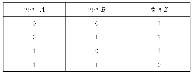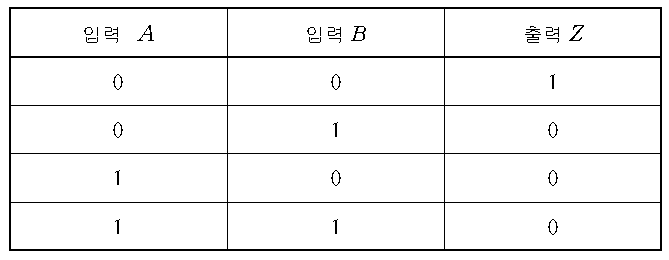 A와 B 중 하나라도 1인 경우 TR의 베이스에 A 또는 B에 입력된 전압이 걸리게 되어 TR이 턴 온이 되어 Z에는 0V가 출력된다. A와 B가 둘다 0인 경우에만 TR의 베이스에 전압이 걸리지 않아 TR이 턴 오프가 되어 Z에 Rc에 걸리는 Vcc가 출력되게 된다.