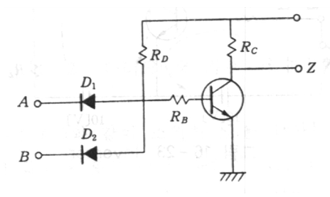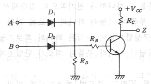 A와 B 중 하나라도 Low가 되면 Rd의 전압이 D1과 D2를 통해 빠져나가게 되어 TR은 차단 상태가 되고 Z는 Rc에 걸리는 전압이 된다. A와 B가 모두 High인 경우에는 D1과 D2가 차단 상태가 되어 Rd에 전압이 걸리고 TR의 베이스에 전압이 걸려 TR이 턴 온 상태가 되어 Z에 Low가 출력되게 된다. 보면 알겠지만 결국 NAND란 말과 같이 AND와 NOT을 합성한 모양이다.