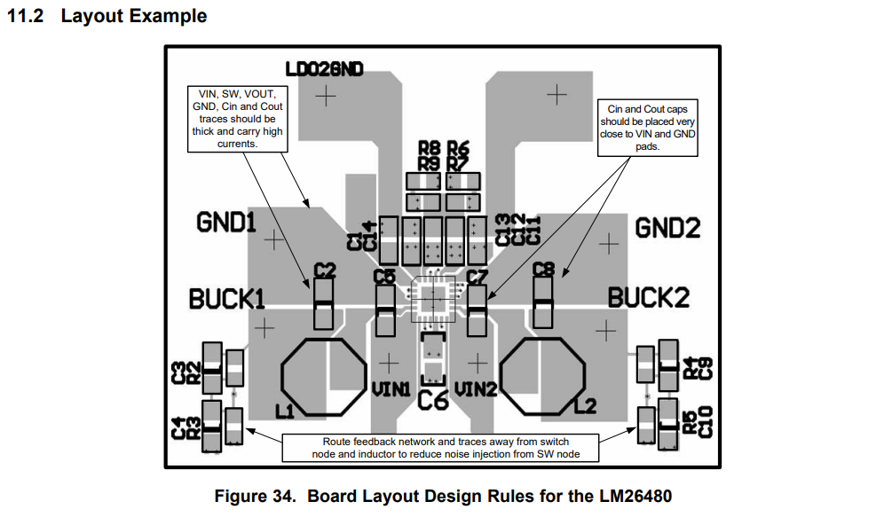 LM26480을 이용한 전원 회로이다. IC의 특징은 FPGA나 DSP에 사용할 전원이 이 IC 하나로 해결이 가능하다는 것이다. 회로가 간단하고 사이즈도 작아 사용하기 좋은 IC이며 각각의 전원이 분리되어 제어가 되기 때문에 사용하기 좋다. 제시된 회로는 상시 ON으로 구성되어 있고 각 전원의 피드백 저항을 계산하여 필요한 전원을 만들어 냈다.