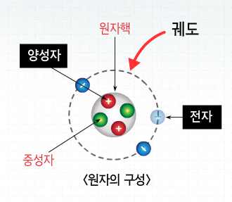 - 양성자와 중성자로 구성된 원자핵을 중심으로 일정한 궤도로 전자들이 돌고 있음