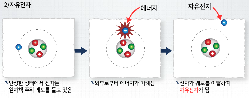 자유 전자는 안정된 상태에서 외부에서 에너지가 가해짐으로서 불안정한 상태가 되어 전자가 궤도를 이탈하는 전자를 말한다. 이 때 이 이탈한 전자를 자유전자라고 하며 이 전자가 이동함으로써 전기가 흐르게 된다.