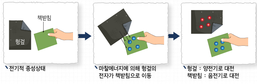 말 그대로 정전기는 움직이지 않고 머물러 있는 전기로 두 물체를 마찰하면 마찰 에너지에 의해 전자의 이동이 발생하고 두개의 물체는 각각 음전기와 양전기로 대전되며 전기를 띠게 된다. 정전기는 물체들이 서로 전자를 주고 받으면서 양전기와 음전기가 쌓이게 되고 어느 한도 이상으로는 전기가 쌓고 머물게 된다. 시간이 지나면 자연 방전으로 정전기가 사라지지만 적절한 유전체가 닿으면 순간적으로 쌓여있던 전기가 방출되게 된다. 정전기는 수만볼트의 높은 전압이 일어나지만 짧은 시간에 소량의 전류가 흐르게 되므로 위험하지는 않지만 외부 전기 충격에 약한 전자 소자들은 정전기로 인해 손상을 입기도 한다.