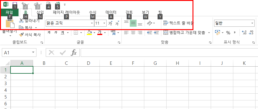 사실 빠른 실행 도구 모음은 그 버튼을 누를 때도 많지만 단축키를 사용하기 위해 사용도 하는데 빠른 실행 도구 모음에 등록된 도구는 "Alt + 숫자" 키로 단축된다. 첫번째 도구인 저장을 누르고 싶다면 "Alt+1"을 누르면 실행된다. 확인은 엑셀 창에서 Alt 키를 누르고 있으면 단축키가 표시되니 참고한다.