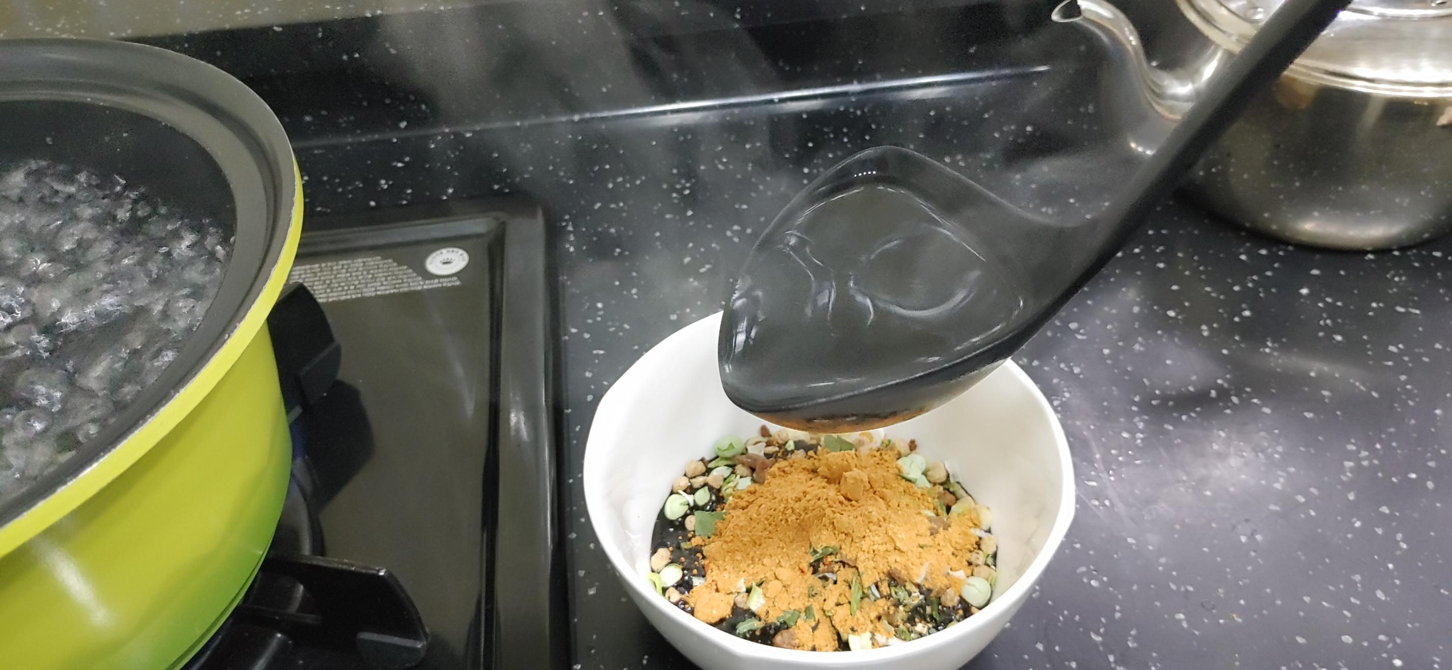 4. 물이 끓으면 한국자 정도를 스프를 넣은 그릇에 넣고 잘 저어준다. 그리고 냄비에는 면을 투하.....