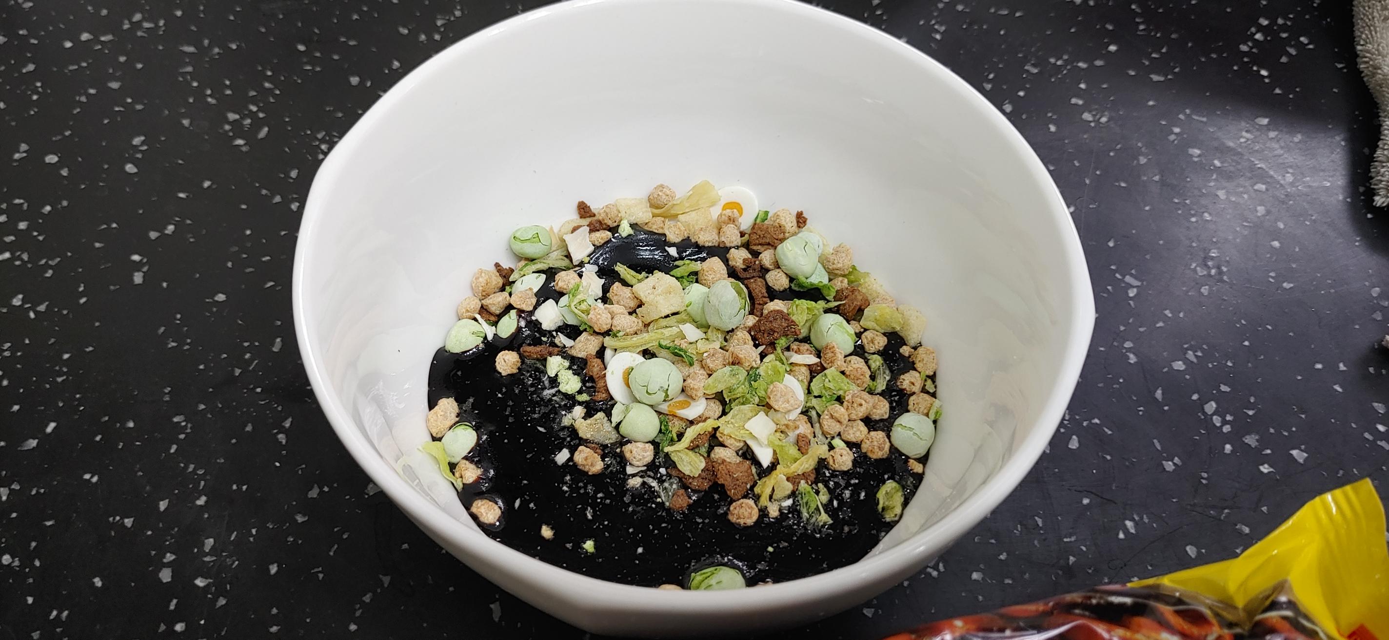 3. 물이 끓는 동안 그릇에 모든 스프를 다 때려 넣는다.