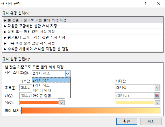 - 위의 데이터 막대, 아이콘 집합 등은 간단하게 만들 수 있게 해 놓은 것으로 새 규칙에서 자세하게 설정도 가능하다.