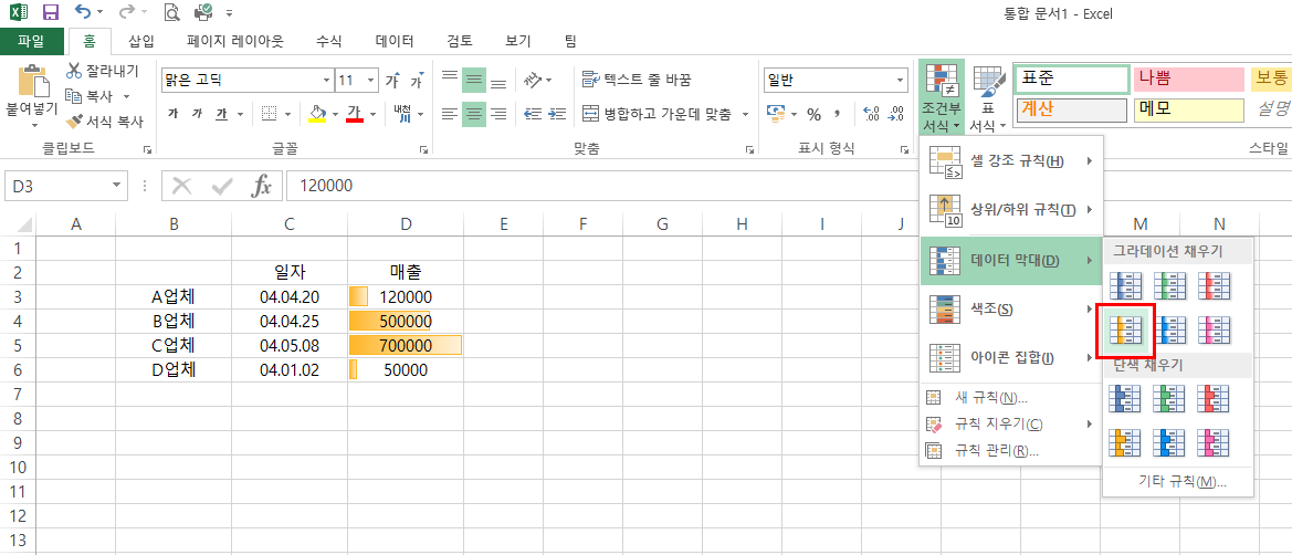 - 데이터 막대는 색이 지정된 데이터 막대를 추가하여 셀의 값을 표시한다. 값이 클 수록 막대가 길어진다. 가장 큰 값이 100%로 이를 기준으로 다른 셀의 크기가 정해진다고 보면 된다.