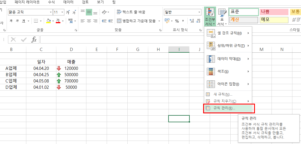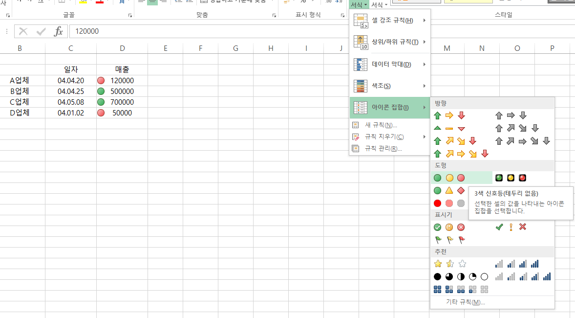 - 아이콘 집합은 선택한 셀의 값을 아이콘으로 표시한다. 표시 아이콘을 정한 후 '규칙 관리'에서 규칙에 대한 세부 사항을 만들면 된다.