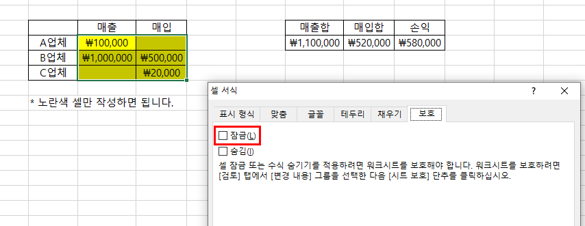 1. 셀을 잠금할 부분과 잠금 해제할 부분을 설정한다. 설정은 각 셀에 '셀서식->보호 탭->잠금'을 해제 또는 체크한다. 기본은 잠금으로 되어 있다. 참고로 잠금으로 되어 있다고 하더라도 시트보호를 하지 않으면 잠금은 의미없다.