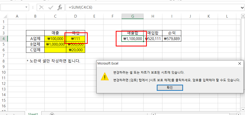 시트보호를 실행하면 노란색 부분은 수정이 되지만 다른 부분은 수정하려고 하면 확인 창이 뜨면서 수정이 안되는 것을 확인 할 수 있다.
