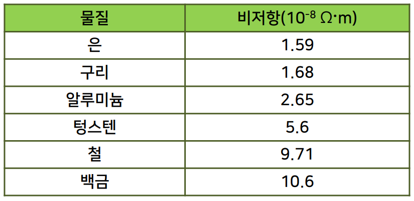 여기서 ρ인 비저항은 물질의 고유 저항값이다. 고유 저항값이란 말 그대로 어떤 물질이 기본적으로 가지고 있는 저항으로 예를 들면 알루미늄은 저항이 낮고 플라스틱은 저항이 높고 같이 재질에 대한 저항이다. 즉, 알루미늄에 전기를 흘릴 때 비저항이 2.62이고 이에 길이에 비례하고 단면적에 반비례한다.