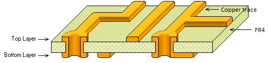 PCB의 구조는 유전체의 양면에 도체가 깔린 형태로 이 도체를 에칭(식각)하여 배선인 패턴을 만들고 윗면과 아랫면을 연결하는 홀 등을 만들어 기판을 만드는 구조다. 일반적인 PCB의 도체는 구리이며 유전체는 유리 섬유 수지인 FR4를 주로 사용한다.