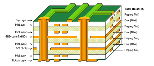 멀티 레이어 기판의 경우 코어에 프리플레그(Prepreg)라는 수지를 끼워넣은 형태로 대부분 짝수의 층을 적층하여 사용한다. 이때 Prepreg는 유전체인 FR4의 경화전 단계로 적층 후 열경화를 통해 중간의 수지가 된다. 즉, Prepreg는 각 층의 유전체 역할을 하면서 각 층을 붙이는 접착가 된다. 좀 더 쉽게 보면 아래와 같은 구조를 가진다.