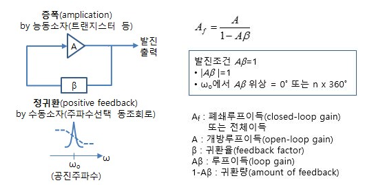 사실 위의 발진기 모두 구성 형태는 동일하다. 다만 발진자를 무엇으로 선택해서 귀환을 돌리느냐의 차이가 존재할 뿐이다. 위 그림과 같이 발진의 원리는 간단하다. 증폭기가 있고 그 출력을 다시 입력으로 피드백(귀환) 시킨다. 이때 귀환하는 루프에 주파수를 선택할 수 있는 공진 회로를 넣으면 내가 선택한 주파수만이 통과하여 계속 커지게 되고 나머지 주파수는 귀환회로에서 잘려서 커지지 않게 된다.