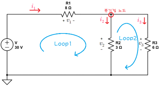 Loop 1에서는 v = v1 + v2 30 = i1*8 + i2*3 i1 = (30-(i2*3))/8