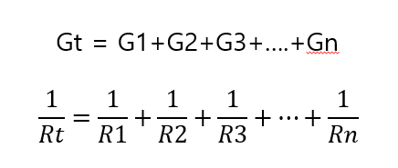 합성 저항은 컨덕턴스로 표기하면 앞선 직류 저항의 합과 같이 표현되지만 당연히 의미는 반대이다. 아래는 컨덕턴스로 표기한 합성 컨덕턴스와 저항으로 표기한 합성 저항의 식을 나타낸다.
