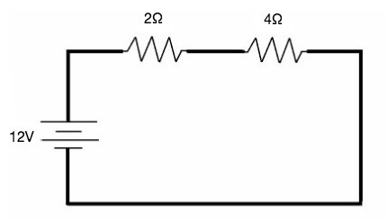 간단한 예로 위와 같은 회로의 합성 저항은 6옴이 되고 흐르는 전류는 2가 된다.