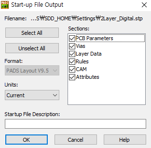 기본 경로는 C:\MentorGraphics\9.5PADS\SDD_HOME\Settings 이다. 현재는 여기에서 밖에 부르는 방법 밖에 모르겠다. 여튼 여기서 부르면 아까 설정했던 사항들을 불러서 사용할 수 있다.