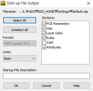 저장을 누르면 이후 나오는 설정에서 저장할 내용을 선택한다. 난 전체를 다 선택한다. 기본은 아래 그림과 같이 CAM은 저장이 안되게 되어있는데 그냥 하는게 좋다. (아마 CAM은 따로 설정을 저장하고 부를 수 있어서 그런거 같기도 하고....) CAM 또한 레이어 설정에 맞춰야 하기 때문이다. Starup File Description에 이 Startup에 대해 내용을 적어 놓으면 구별하기 더 쉬워지니 적어놓는 것도 추천한다.