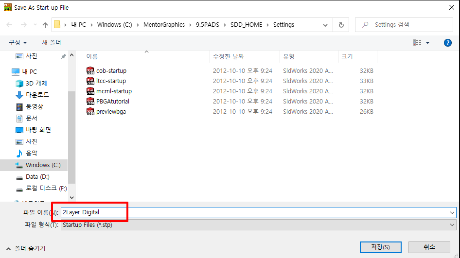 선택하면 Startup 파일을 저장할 경로와 이름을 지정하게 되있는데 기본 경로에 이름을 넣어서 저장한다.