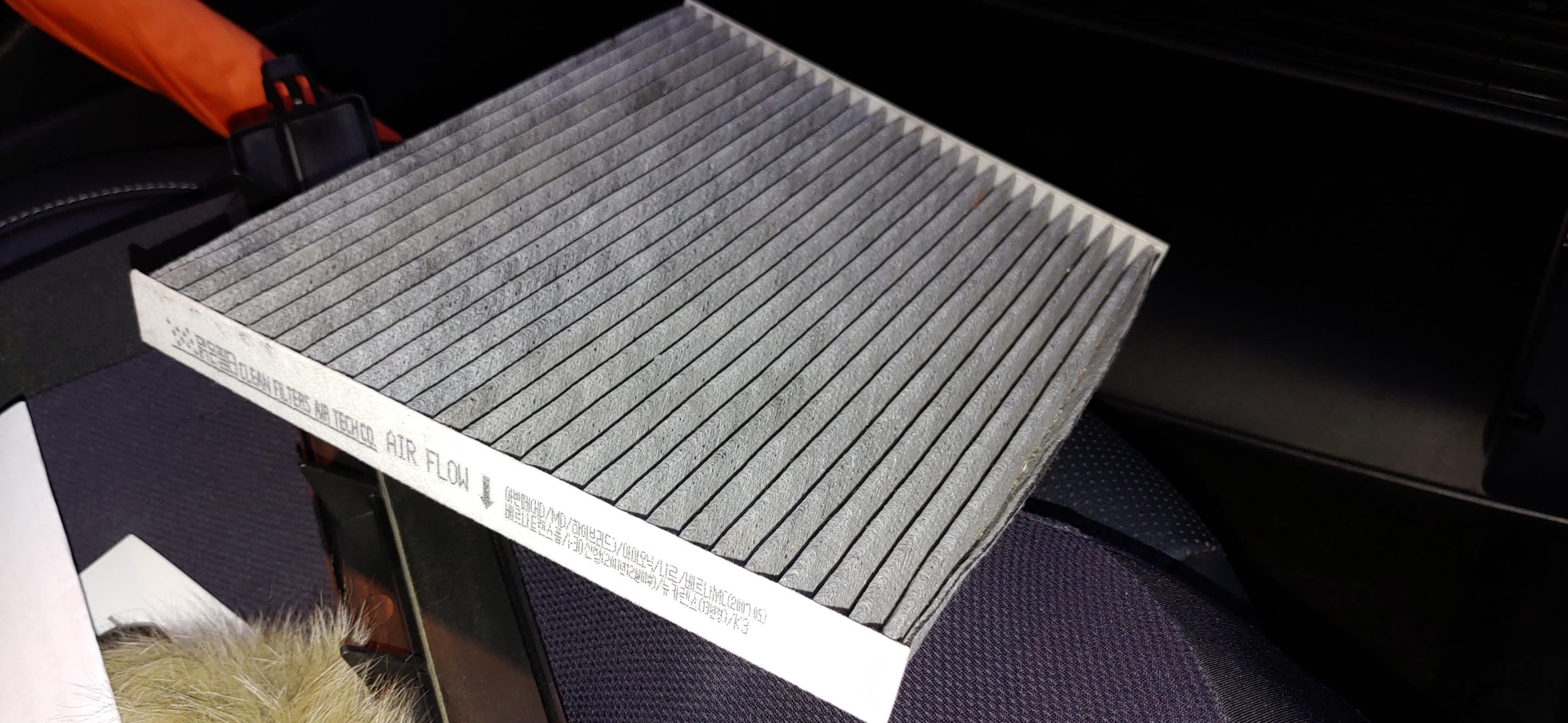 4. 뚜껑을 제거하면 필터가 들어있는데 빼보니 꽤 오염되어 있다. 처음 넣어져있던 방향 잘 기억하고 빼낸다. 니로 에어컨 필터는 딱딱한 부분이 양옆으로 들어가고 옆부분에 글씨가 똑바로 화살표가 아래로 가게 장착한다. 어떤 분은 저걸 잘못넣어서 길이가 안 맞아서 앞으로 튀어나와 글씨가 써 있는 딱딱한 부분을 잘라내고 넣었다는 분도 있는데 방향 주의해서 넣는다.
