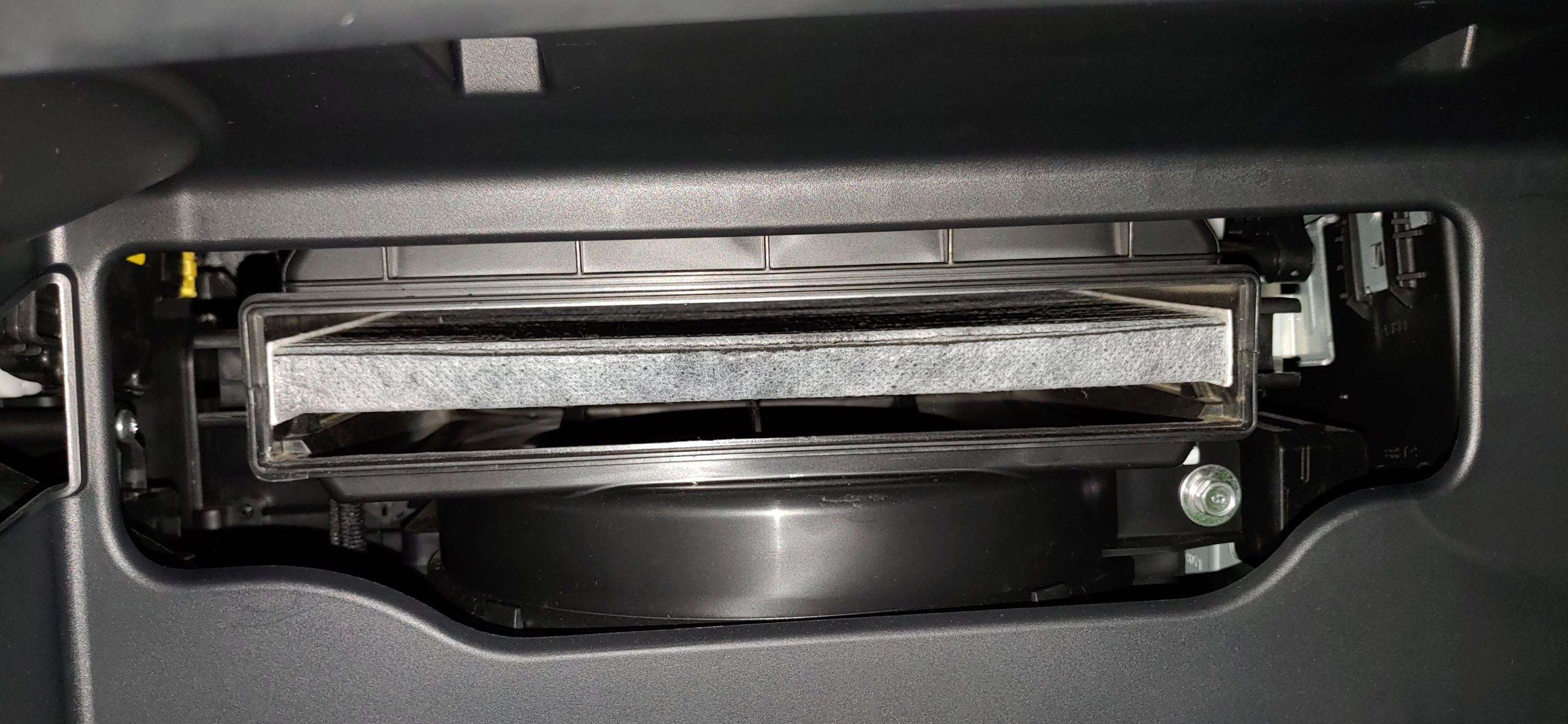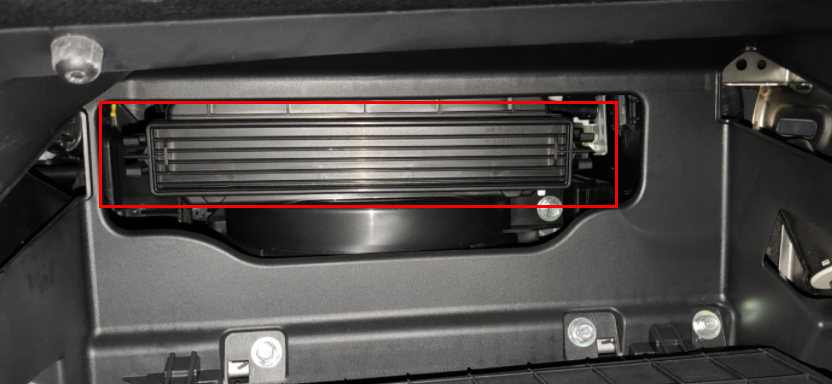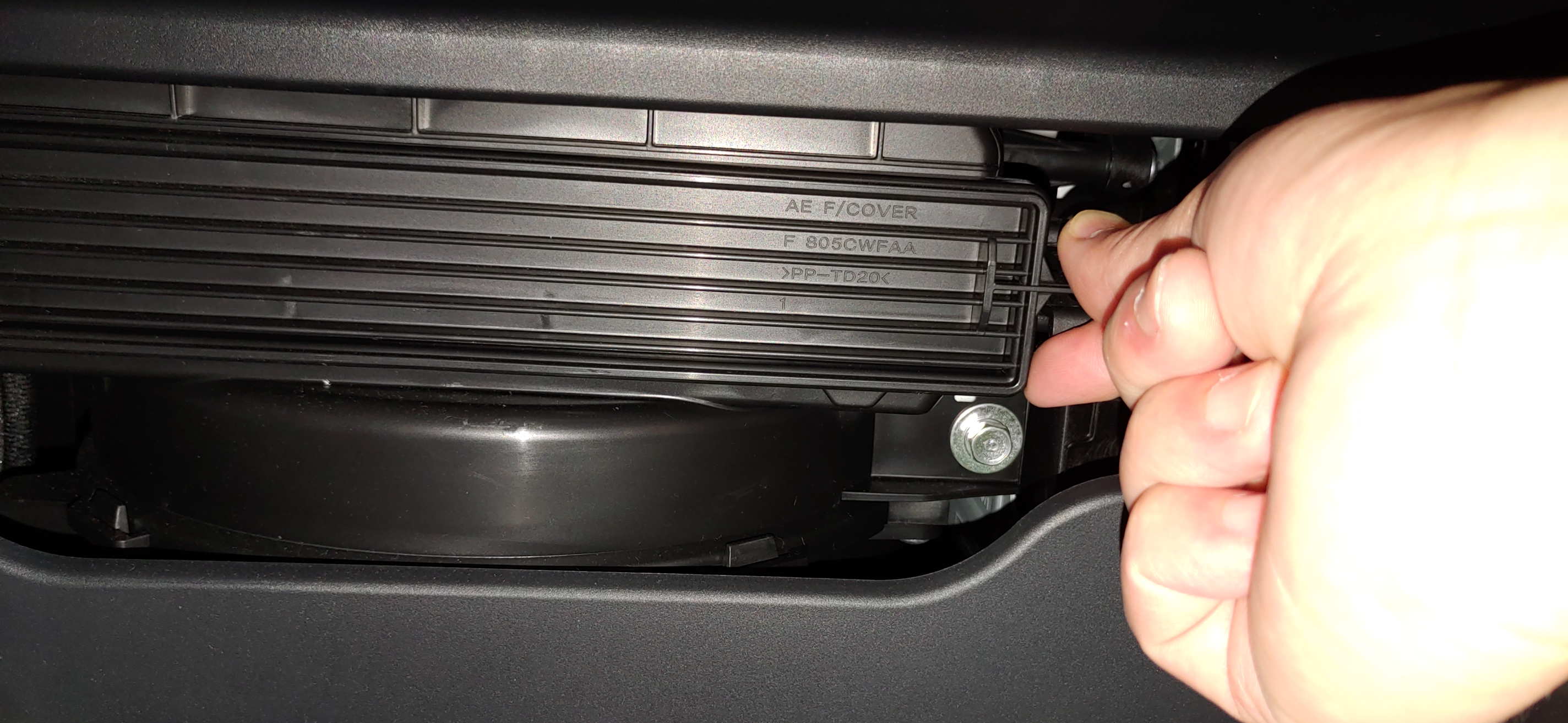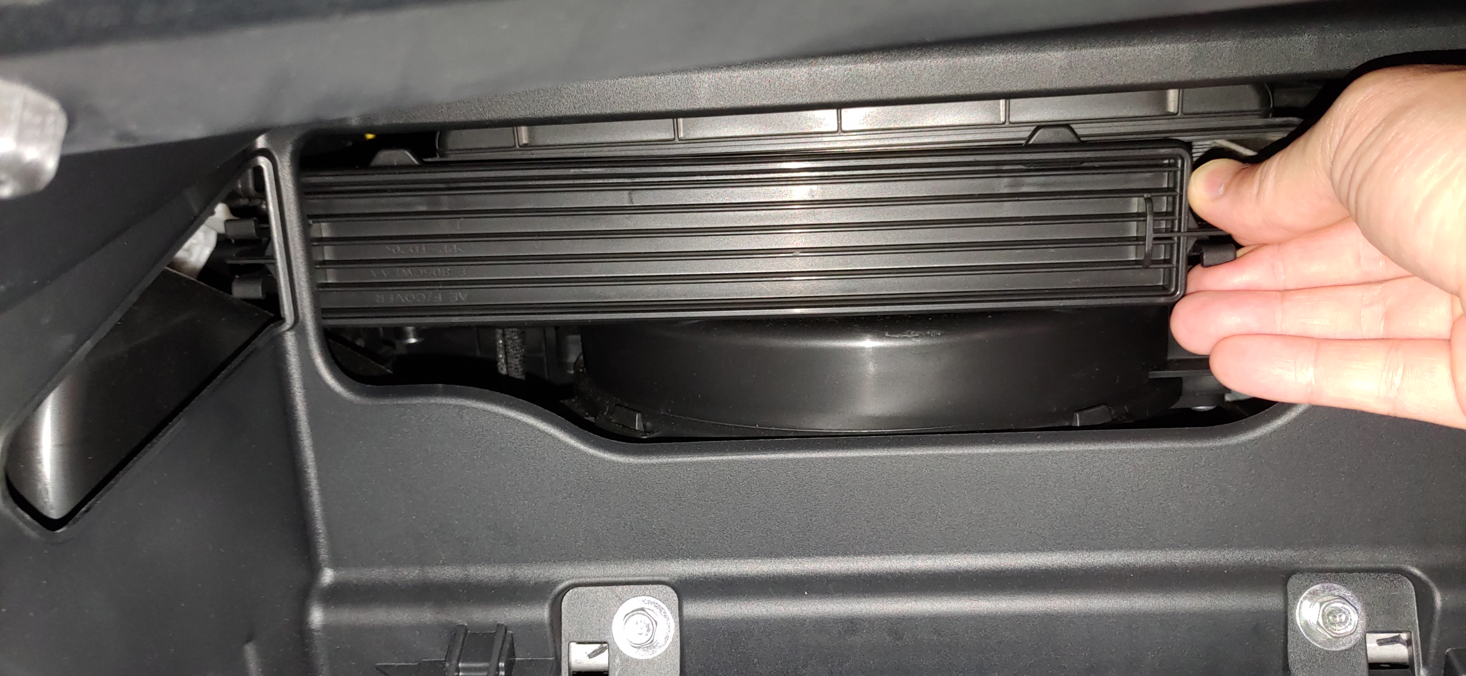 3. 2번 작업을 하면 완전히 아래로 벌어져서 대시보드 뒤쪽에 보이는데 여기에 에어컨 필터가 들어있다. 양 옆쪽에 누를 수 있게 되어있는 부분을 눌러서 커버를 제거한다.