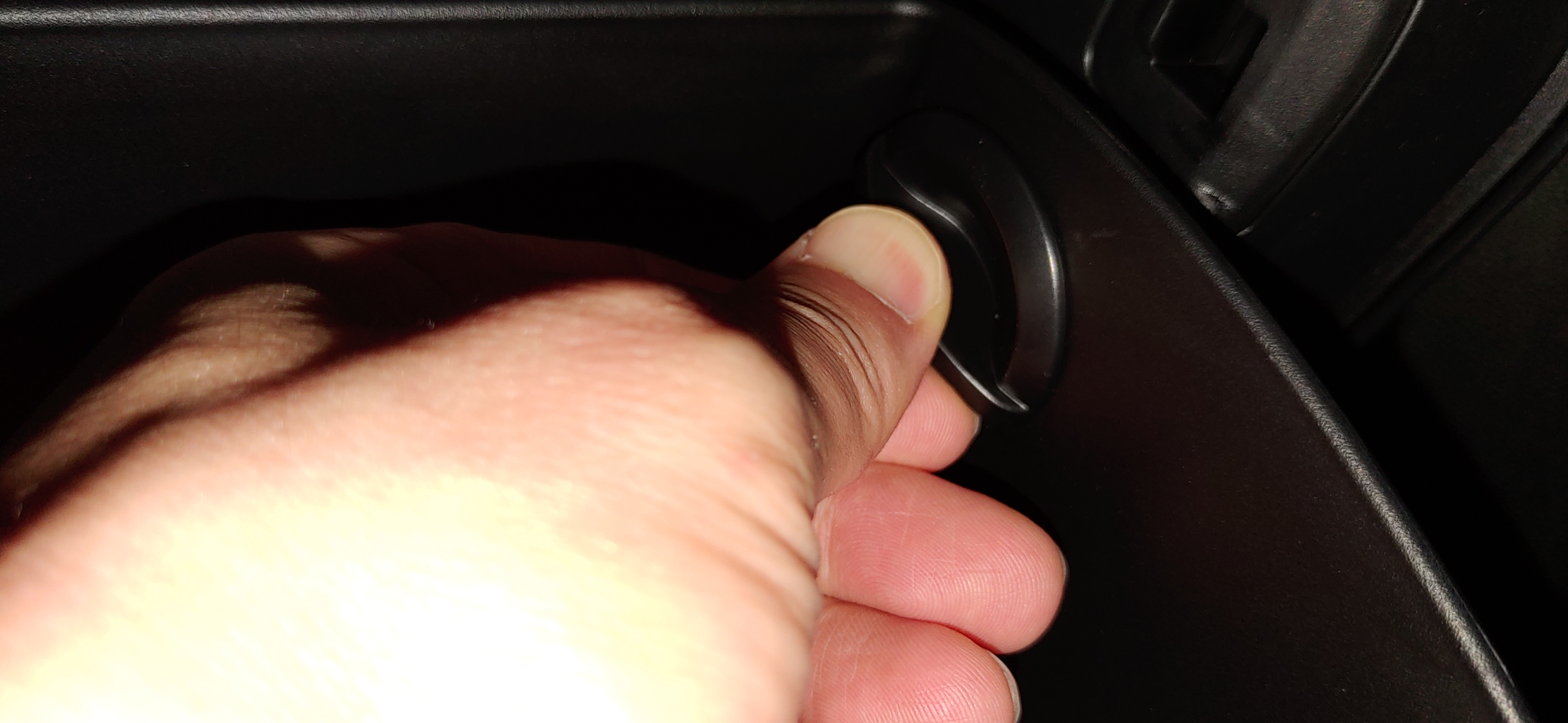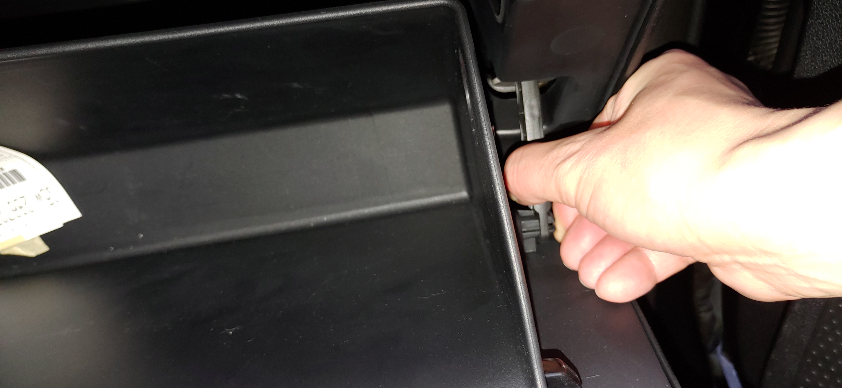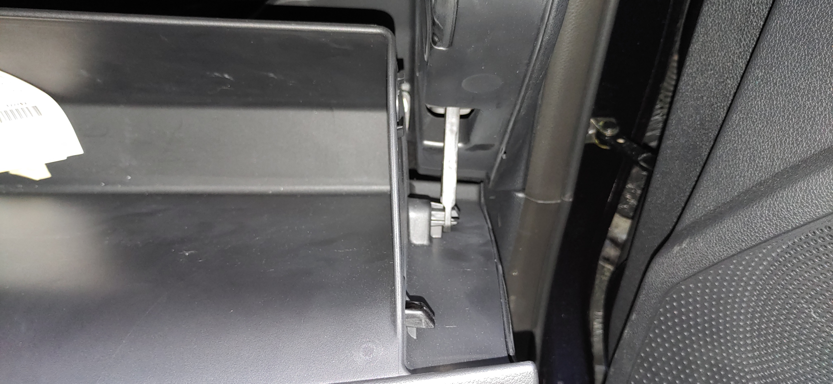 3. 2번 작업을 하면 완전히 아래로 벌어져서 대시보드 뒤쪽에 보이는데 여기에 에어컨 필터가 들어있다. 양 옆쪽에 누를 수 있게 되어있는 부분을 눌러서 커버를 제거한다.