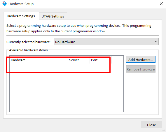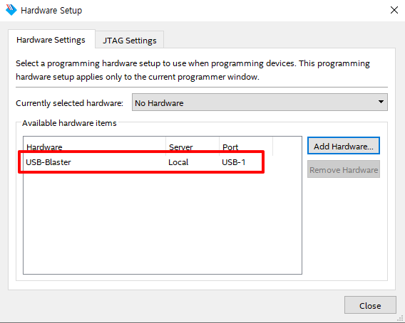설치가 잘되었으면 Quartus에서 위와 같이 USB-Blaster가 잡힌다.