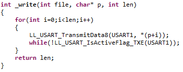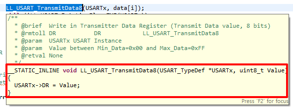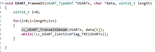 LL_USART_TransmitData8 함수는 1byte의 데이터를 USARTx 포트로 내보내는 함수이다.