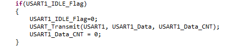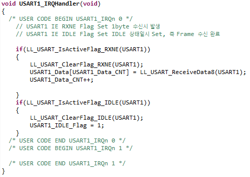 stm32l1xx_it.c 파일(_it 파일이 인터럽트 파일)에서 USARTx_IRQHandler 함수를 찾아서 처리를 해준다. 해당 내용은 수신 인터럽트 발생시 RXNE가 set 되었는지 확인 후 되었다면 RXNE를 클리어 후 USART1_Data 배열에 1byte를 저장 후 Counter를 증가시키며 이를 반복하여 Data를 저장한다. 그리고 IDLE Flag가 발생하면 IDLE Flag를 클리어 후 Flag를 Set하여 main에서 확인 후 처리한다.