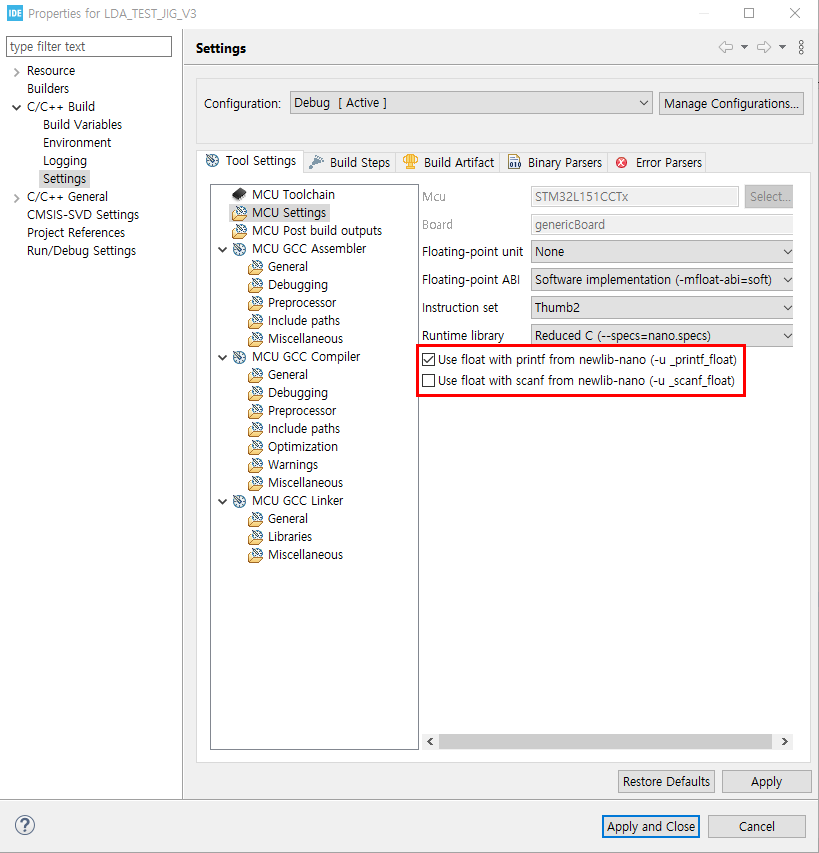 printf문을 사용할 때 Float를 사용할 때 안되는 현상이 있는데 이부분은 Project->Properties에서 C/C++ Build->Settings->Tool Settings->MCU Settings에서 체크박스를 선택하면 된다.