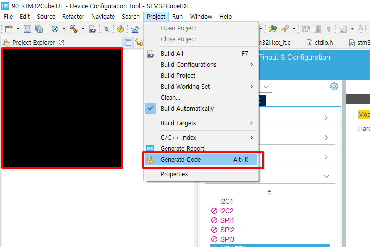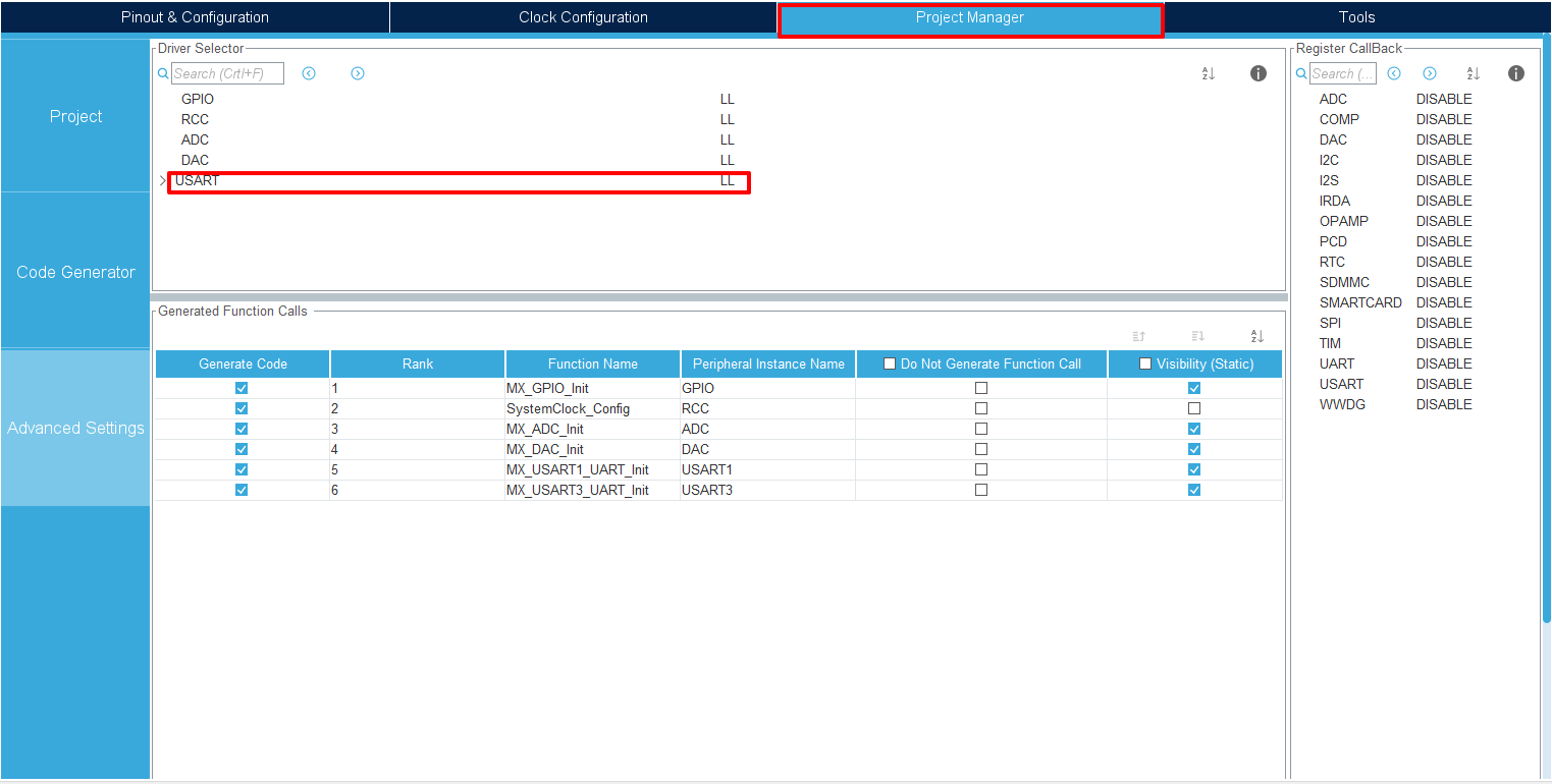 사용할 드라이버를 설정하고 코드 생성을 한다. 드라이버는 LL을 사용하기로 했으니 LL로 설정한다. 코드 생성은 "Project->Generate Code"를 선택하던지 아님 저장을 하면 코드가 자동으로 생성된다.....정말 편하긴 하다....
