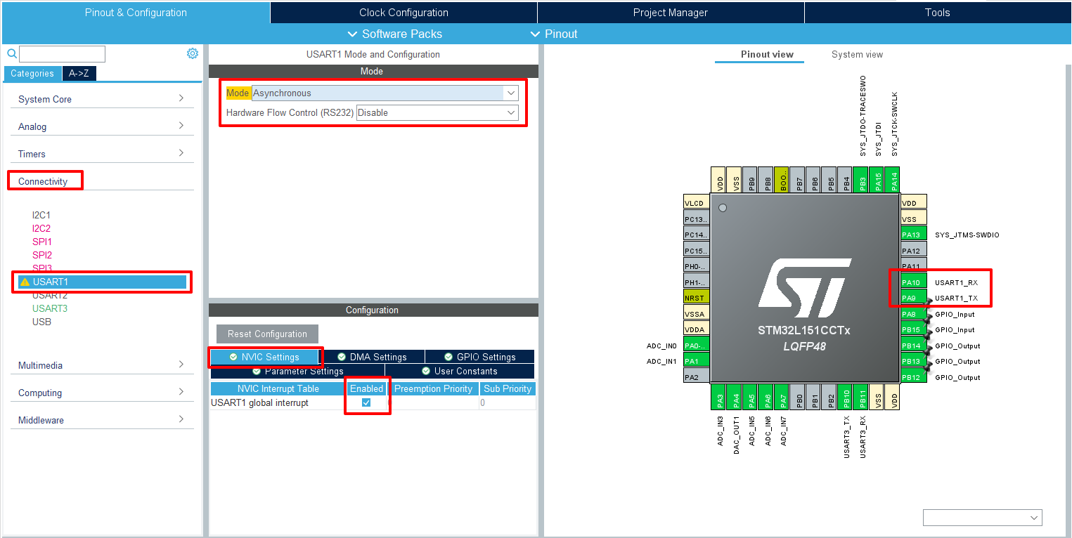 선택 하면 오른쪽 "Pinout view"에 핀이 할당된다. 그리고 설정을 해야하는데 TX는 특별한 설정이 필요하지 않지만 RX는 폴링으로 할 경우를 제외하고는 일반적으로는 인터럽트를 사용하므로 "Configuration->NVIC Settings"에서 global interrupt를 Enable 시킨다.