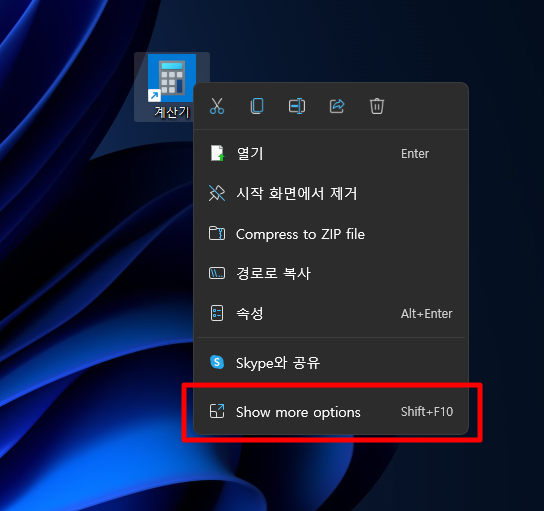 1. 등록할 프로그램에서 오른쪽 버튼 누르면 기존과 다른 메뉴가 나오는데 'Show more options'를 누르면 기존과 똑같이 나온다.