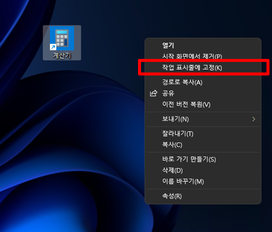 2. 기존과 동일한 메뉴가 나오면 '작업 표시줄에 고정' 표시가 나타난다.