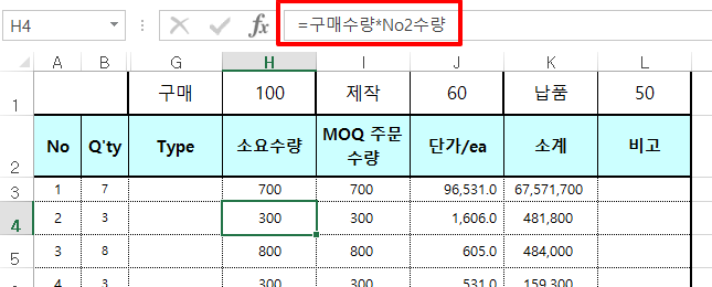 위 경우처럼 1번 항목의 소요 수량은 구매 수량인 H1과 Q'ty인 B3의 곱이다. 즉 H3 = H1*B3가 된다. 그리고 H4의 경우는 H1*B4가 된다. 이러다 보니 H3는 H$1*B3로 하고 셀을 내려서 복사한다. 하지만 이름 정의를 사용하면