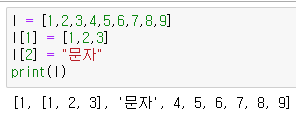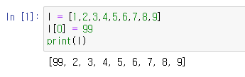 이와 같이 l[0]에 다른 자료를 대입하여 리스트의 요소 값을 변경할 수 있다.