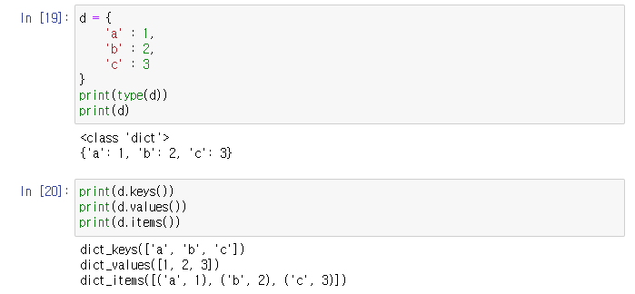 리스트나 튜플 자료형 같이 사전 자료형 또한 함수를 활용할 수 있다. 함수를 활용해 키, 값을 따로 뽑아 리스트에 반환할 수 있다. Json, XML 형식과 유사하기 때문에 NoSQL, OPEN API, 빅데이터 분석 등에 많이 활용된다.