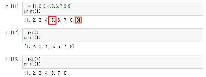2. pop 함수 : 해당 인덱스의 값을 리턴 후 삭제한다. 인자는 인덱스로 인자를 넣지 않으면 마지막 인자가 선택된다.