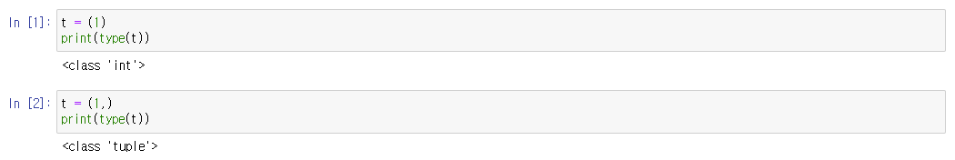 튜플은 정의시 소괄호로 정의를 하기 때문에 하나의 원소만 튜플로 정의할 경우 다른 자료형과 혼동되게 정의가 될 수 있다. 이 때는 콤마를 넣어서 튜플 자료형으로 정의한다.