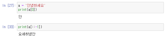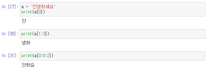 4. 범위 선택 : 문자열을 범위를 선택할 수 있다. (슬라이싱) 이 때 콜론(:)을 이용하고 첫번째는 시작 인덱스(이상), 두번째는 종료 인덱스(미만), 세번째는 스탭이다. 비워둘 시 첫번째는 0으로 두번째는 최대값으로 세번째는 1이 기본이다.