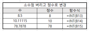 INT 함수는 소수점을 포함하는 실수값에서 소수점 이하의 값을 버리고 주어진 실수보다 크지 않은 정수값으로 내림하는 함수 (즉 소수점을 버리고 정수로 변경)