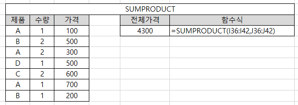 SUMPRODUCT 함수는 두 개 이상의 배열을 인수로 지정했을 때 해당 요소들을 모두 곱한 후 다시 합계를 구하는 함수이다. SUMPRODUCT 함수는 인수로 지정된 배열들의 행과 열이 같아야 각 요소들끼리 곱할 수 있다.