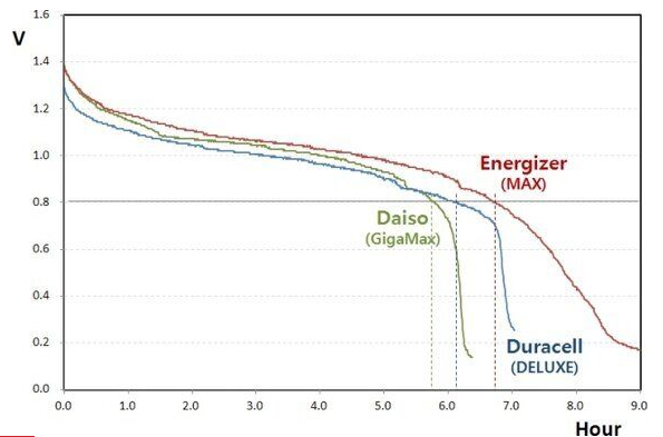 다른 사이트에서 얻은 이 그래프를 보면 일정한 로드를 달아서 전압 대 시간 그래프를 그려놓은 것이 있는데 이 그래프에서 보듯 어느정도는 일정하게 전압이 유지되다가 급격하게 떨어지는 부분이 있다. 이 부분에서는 내부에 전하가 없어서 전류량이 줄고 그로인해 전압이 급격히 떨어진다고 보면 되겠다.
