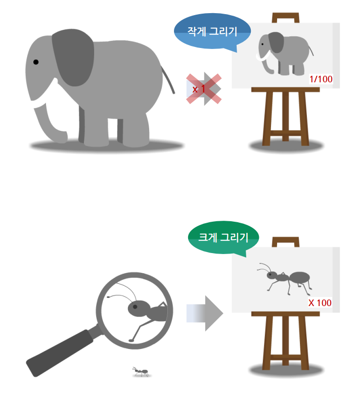 도면작업에서의 척도는 네이버 지식 사전에서의 비율척도를 의미한다. 즉 어떤 대상의 길이를 일정한 비율로 늘이거나 줄이는 것이 척도이다. 척도라고 하니까 오히려 좀 이상한데 스케일, Scale 이라고 하는게 더 일반적이다.