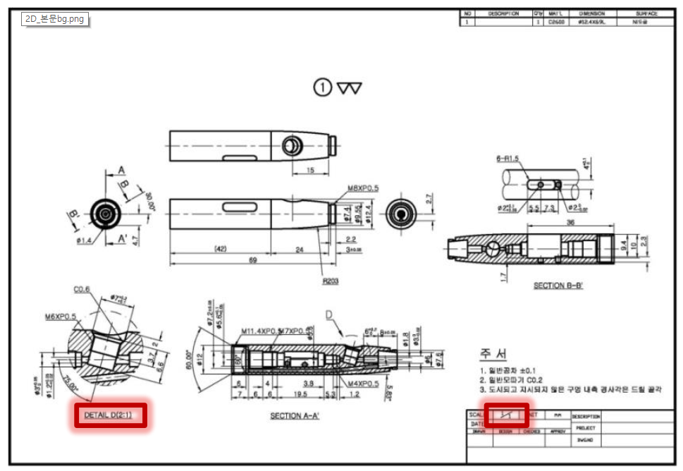 2D 도면에서 척도의 사용은 순위가 있는데 1순위, 2순위가 있다. 1순위는 제일 기본이 되는 척도이고 2순위는 1순위가 적용이 어려울 경우 보조적인 척도이다.