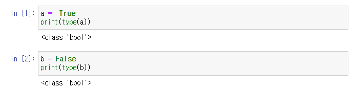 불 자료형은 다른 언어와 마찬가지로 참(True)과 거짓(False)을 나타내는 자료형으로 오직 참과 거짓 두 가지 값만 가질 수 있다. 파이썬 또한 C언어 처럼 대소문자를 구별하기 때문에 정확히 True, False로 사용해야 한다.