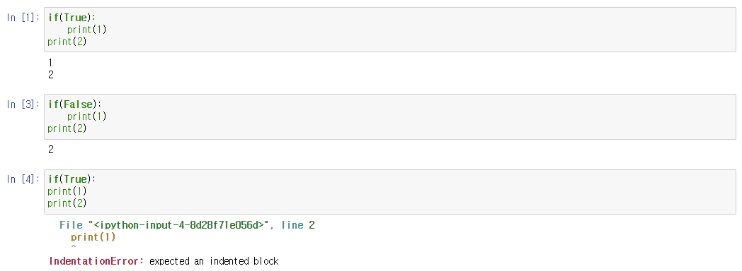 if else는 조건이 맞으면 if 틀리면 else로 가는 조건문이다. 역시 들여쓰기를 주의해야 하며 if와 else는 같은 레벨로 들여쓰기 레벨도 같게 사용해야 한다.