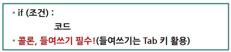 조건문은 프로그램의 실행을 제어하기 위한 제어문 중 하나로 조건에 따라 분기가 발생하여 실행 결과를 다르게 할 수 있다. 파이썬의 조건문은 들여쓰기가 매우 중요하다. C 같은 언어에서는 들여쓰기는 사용자의 편의를 위해 사용했지만 파이썬은 들여쓰기로 문법을 판별하기 때문에 들여쓰기가 제대로 되지 않으면 에러가 난다.
