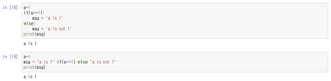 파이썬에서는 if문을 연산자처럼 사용할 수도 있다. 이로서 여러줄로 쓰여있는 if문을 한 줄로 요약하듯 사용할 수 있다. 형태는 if(조건) else이다.